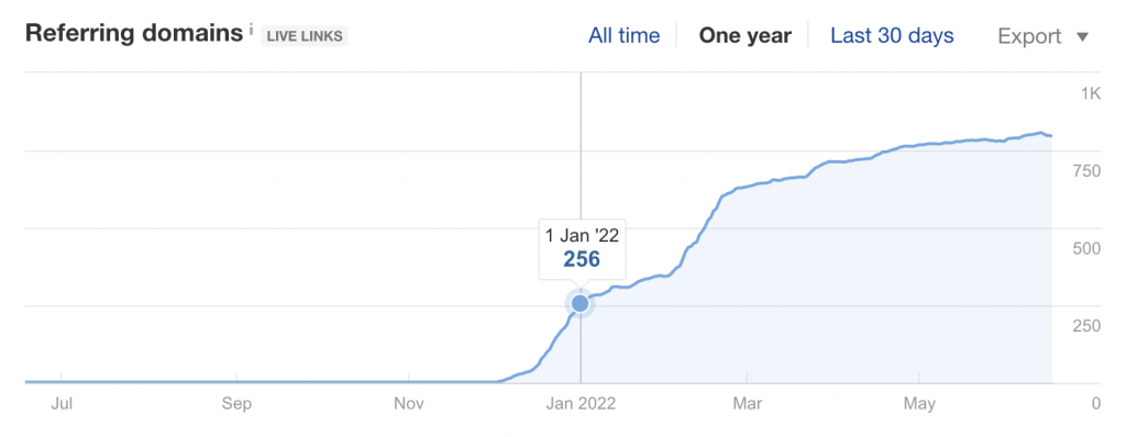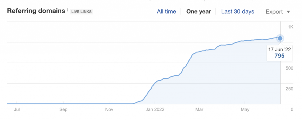 As you can see in the image below, the site’s organic traffic, traffic value, organic keywords, and backlinks are consistently improving as well.